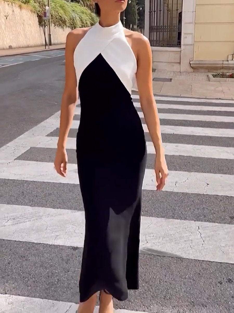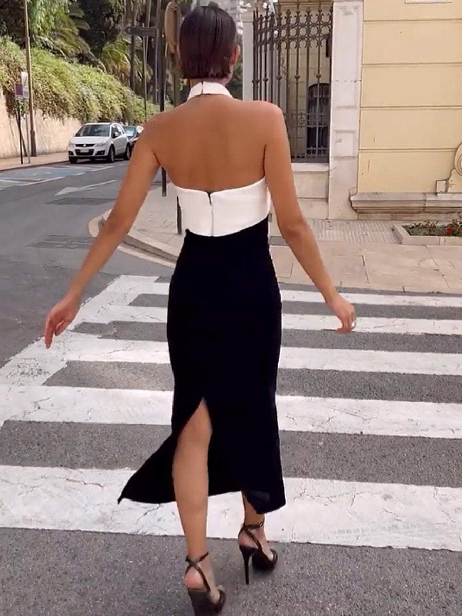Product Name Elegant Hanging Neck Shoulder Contrast Evening Dress
