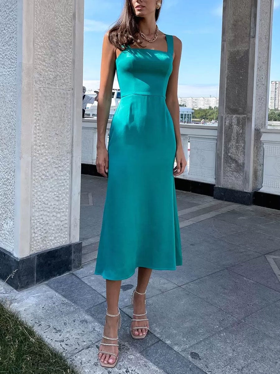 Elegant SATIN Wrap Chest Sleeveless Mid Length Evening Dress