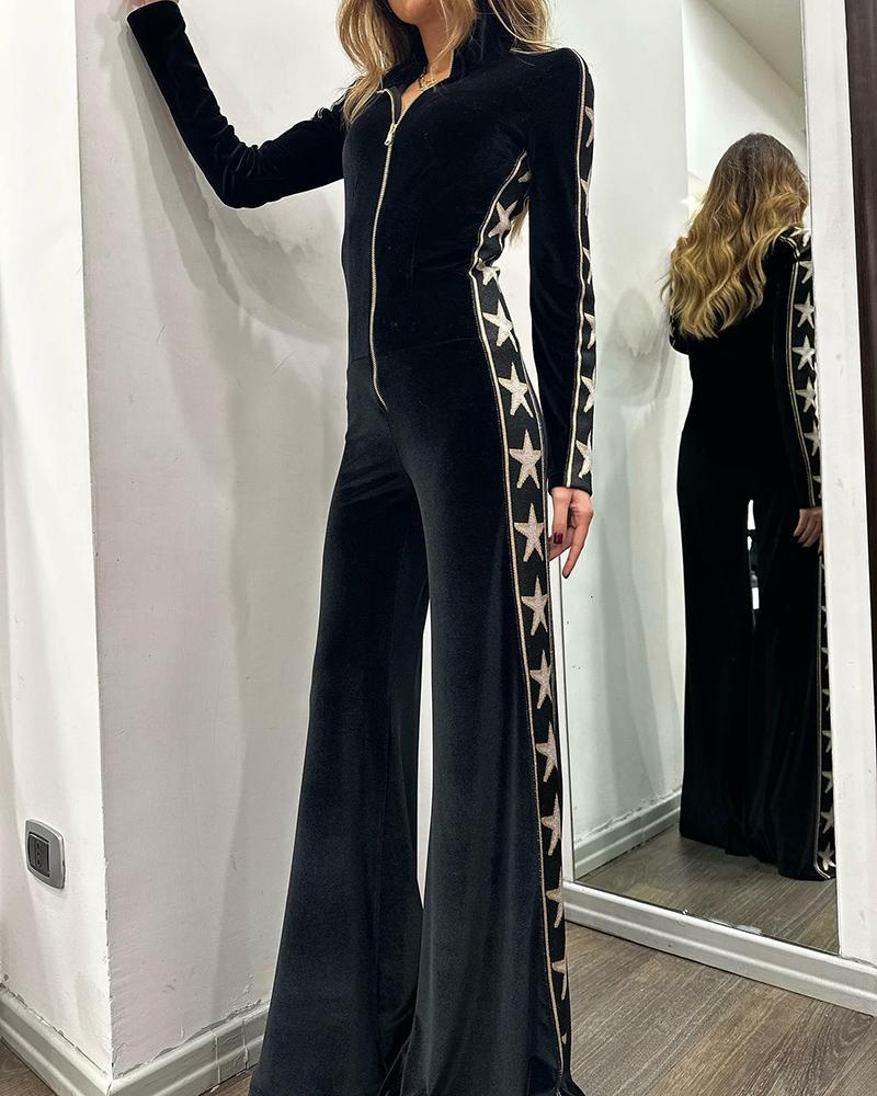 Long-sleeved velvet jumpsuit with zipper