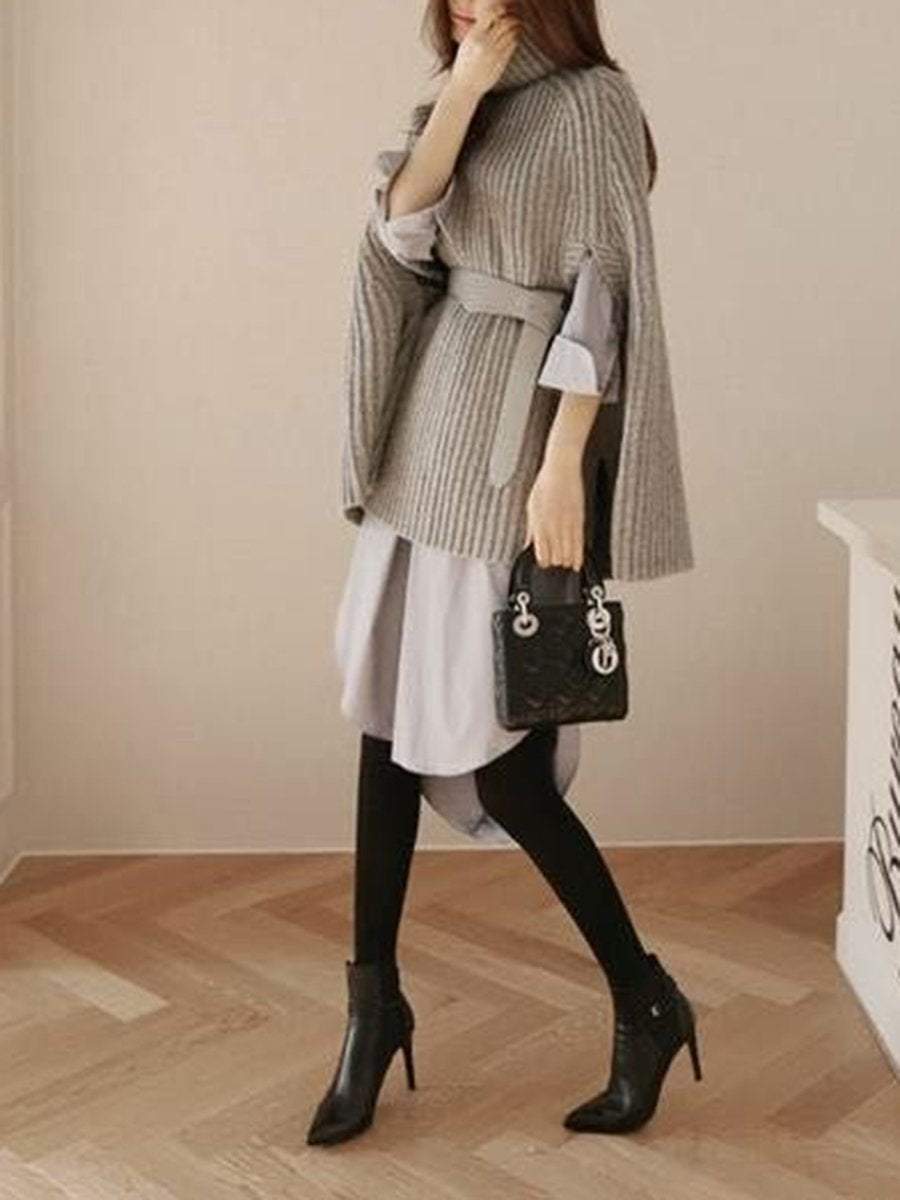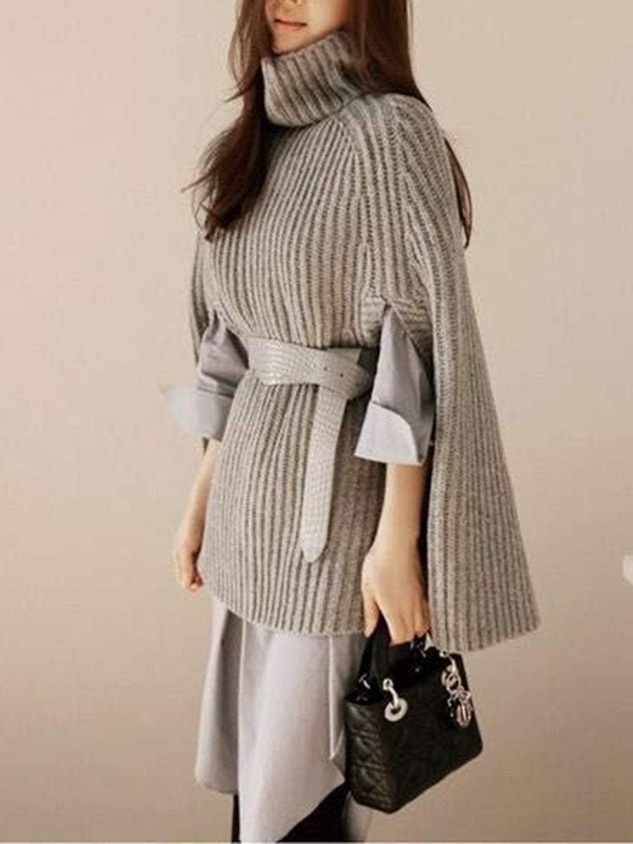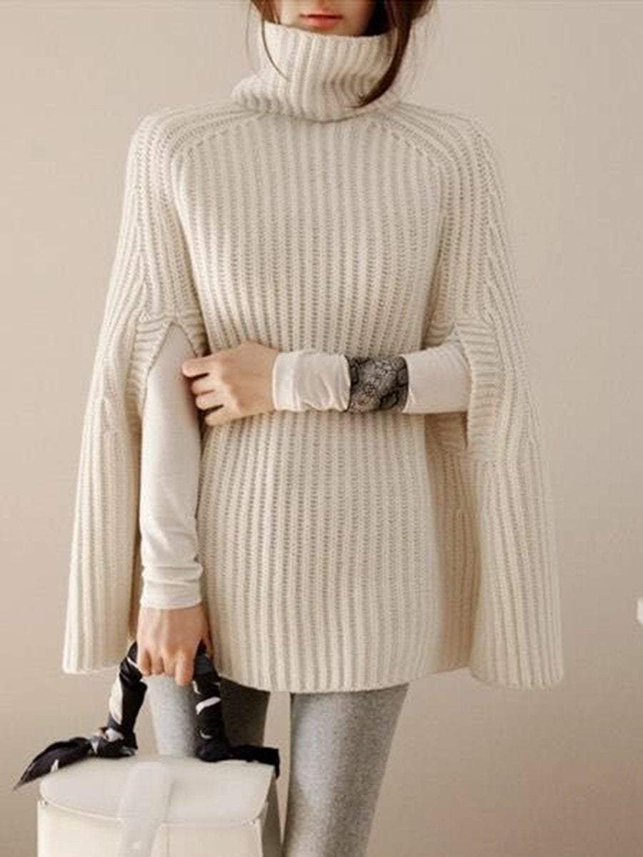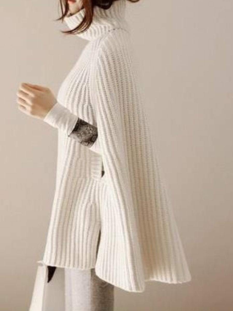 A pullover with a high collar that goes with a poncho knit sweater with split ends