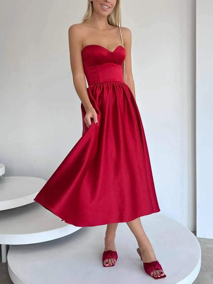 Elegant SATIN Wrap Chest Sleeveless Mid Length Evening Dress