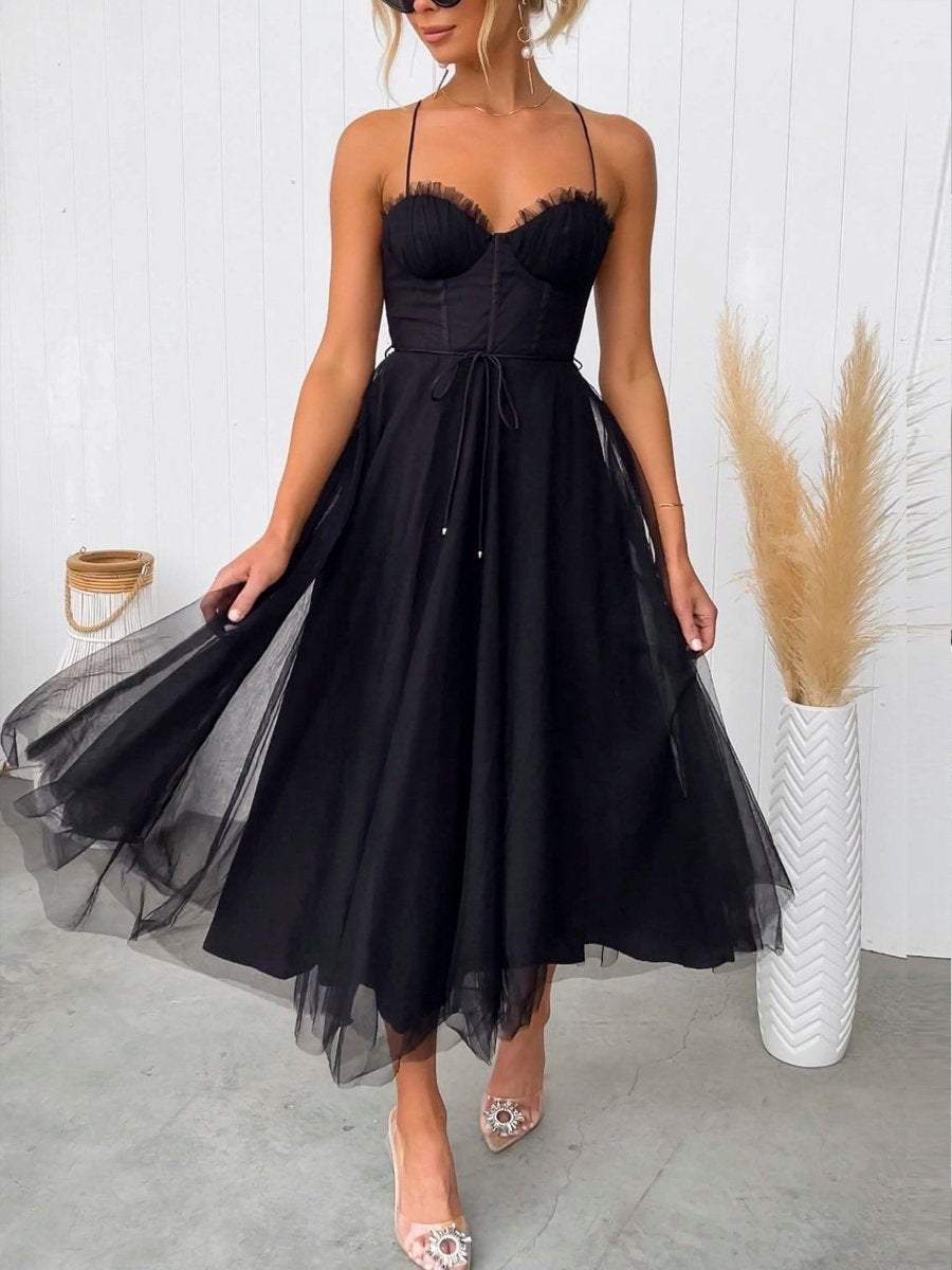 Product Name Cross-Strap Backless Mesh Mid-Length Evening Dress
