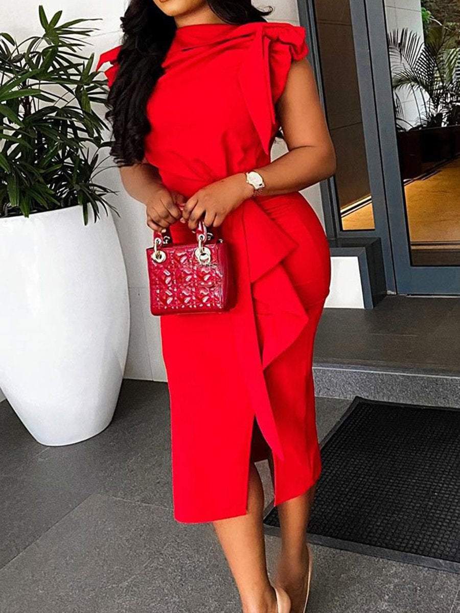 Elegant SATIN Wrap Chest Sleeveless Mid Length Evening Dress