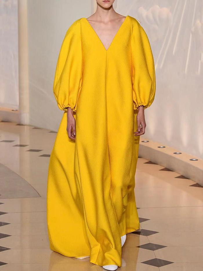 White V-neck Long-sleeved Simple Dress In The Long Section