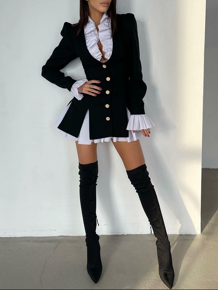 Elegant Pleated Long Sleeve Black Two Piece Suit