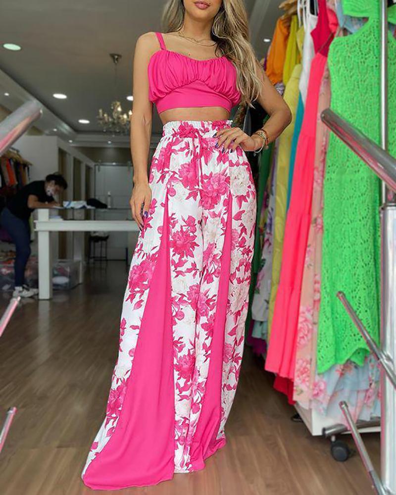 Two-piece set of cropped suspender top & printed wide-leg pants